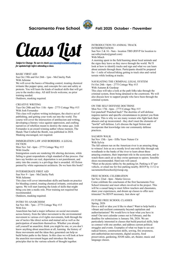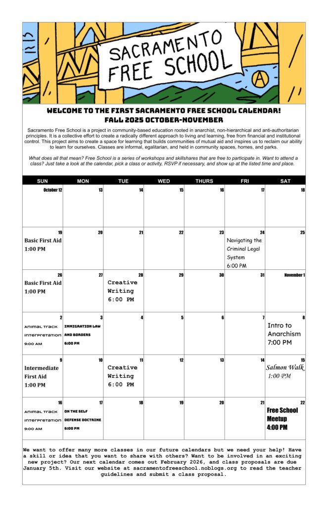 Have a skill or idea you’d like to share? Want to help build a vibrant and resilient community beyond capitalism and authoritarianism? We would love to hear what you have in mind! Our next calendar comes out in February, and the deadline for submissions is January 5th, 2026. We are particularly interested in classes that build practical skills, help us connect with one another, and address current political struggles and events. Examples of what we hope to see are: radical history, construction skills, sewing, fire awareness, anti-authoritarian movements, digital security, food preservation, gardening, HAM radio, art, theater, music and language classes.