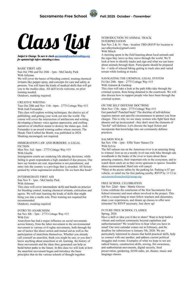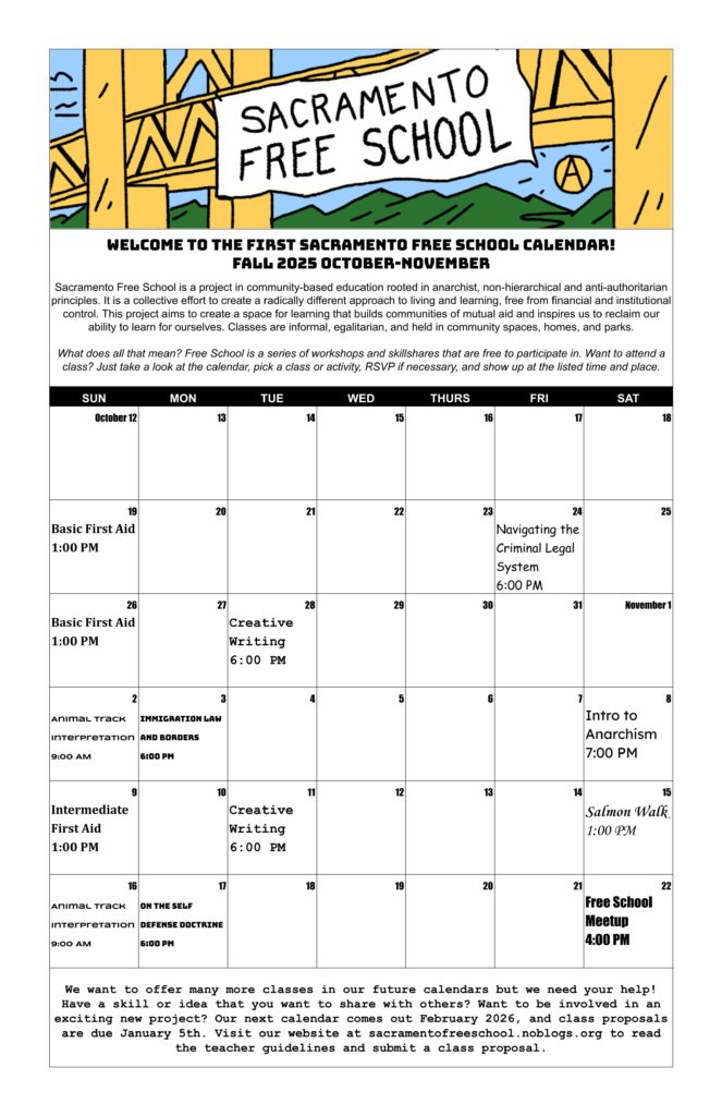 Have a skill or idea you’d like to share? Want to help build a vibrant and resilient community beyond capitalism and authoritarianism? We would love to hear what you have in mind! Our next calendar comes out in February, and the deadline for submissions is January 5th, 2026. We are particularly interested in classes that build practical skills, help us connect with one another, and address current political struggles and events. Examples of what we hope to see are: radical history, construction skills, sewing, fire awareness, anti-authoritarian movements, digital security, food preservation, gardening, HAM radio, art, theater, music and language classes.